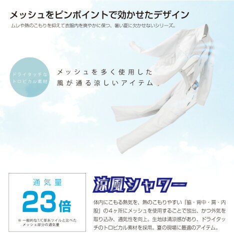 通気量23倍!【涼風シャワー】 体内にこもる熱気を、熱のこもりやすい 『脇・背中・肩・内股』の4ヶ所にメッシュを使用することで 放出、かつ外気を取り込み、通気性を向上。