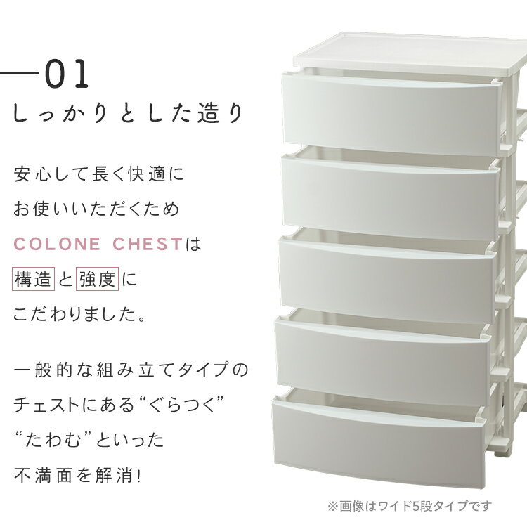一般的な組み立てタイプのチェストにある“ぐらつく“たわむ”といった不安面を解消!天板裏に2本のパイプをはめ込むので天板の上に物を載せても引き出しの開け閉めがスムーズにできます。